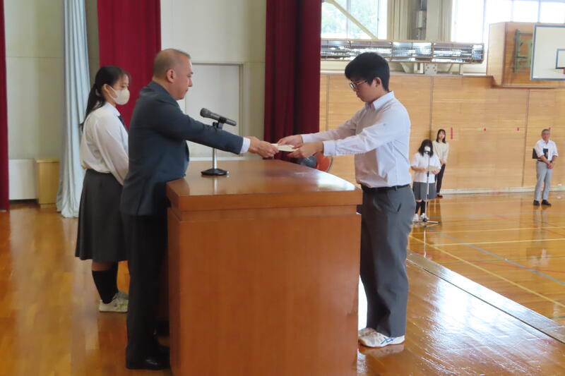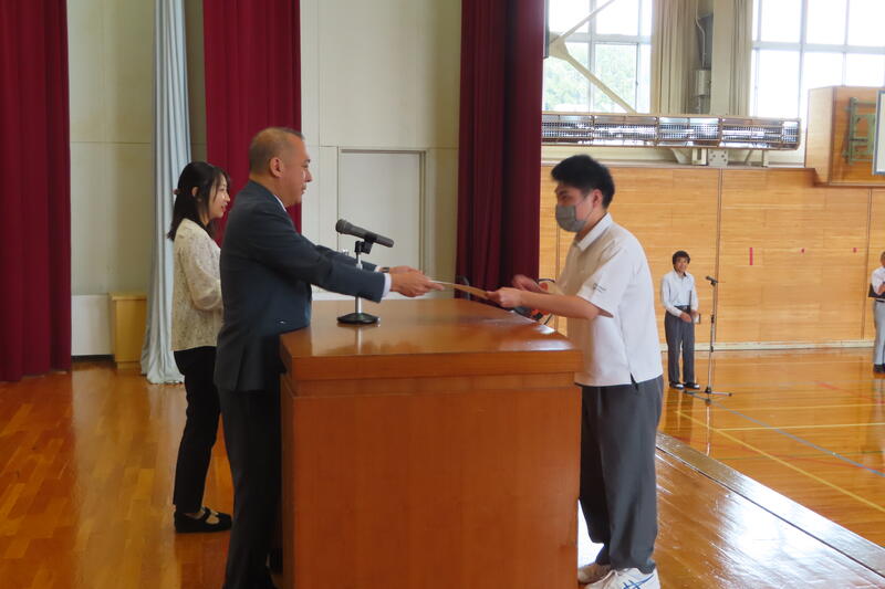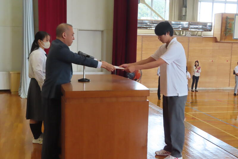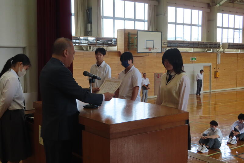 始業式では、簿記合格の伝達表彰があり、その後、校長講話と生徒指導部長からのお話がありました。