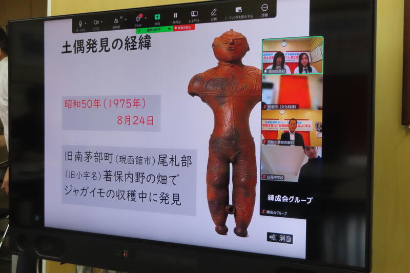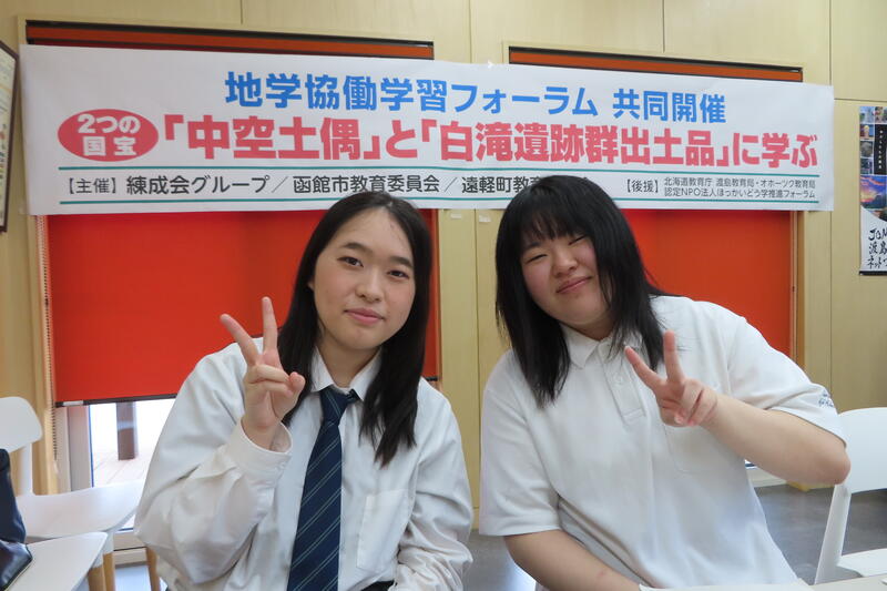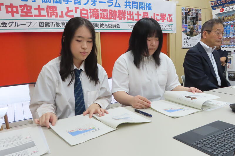 本校からは「国宝土偶(中空土偶)の紹介とその意義」について発表し、白滝中学校からは「国宝北海道白滝遺跡群出土品の紹介とその意義」が発表されました。