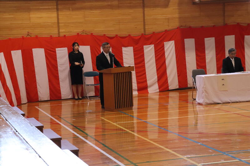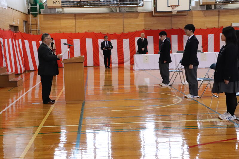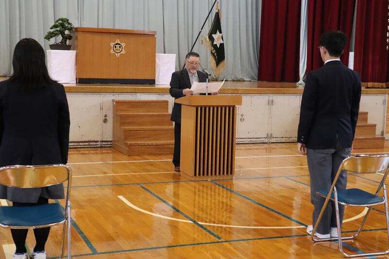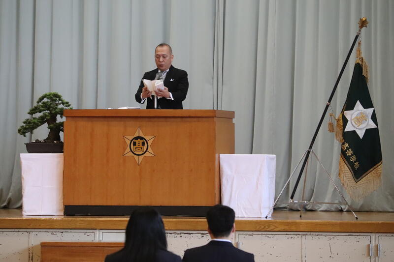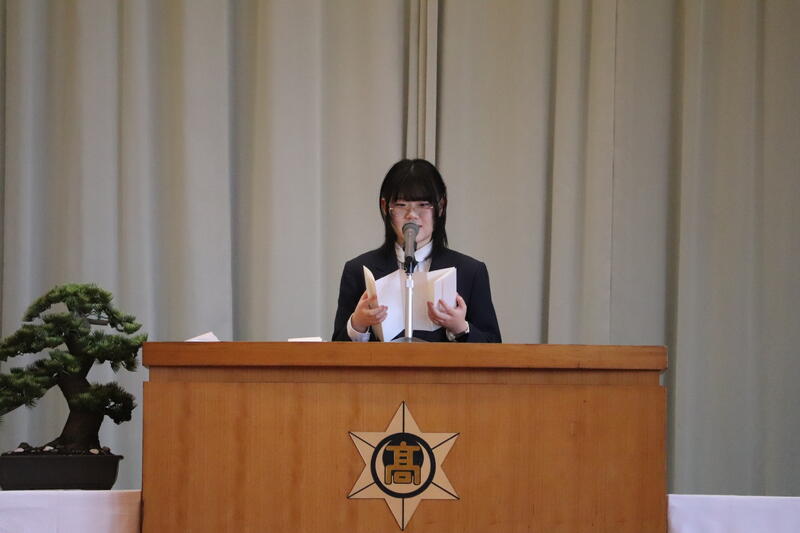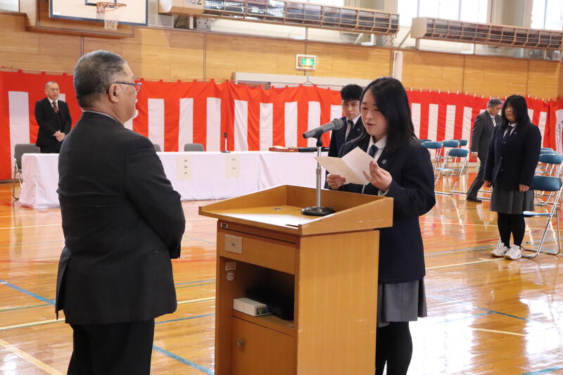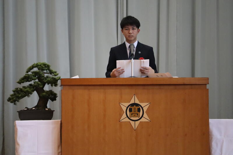 同窓会長より温かい激励の言葉をいただき、その後、代表生徒が決意を述べました。