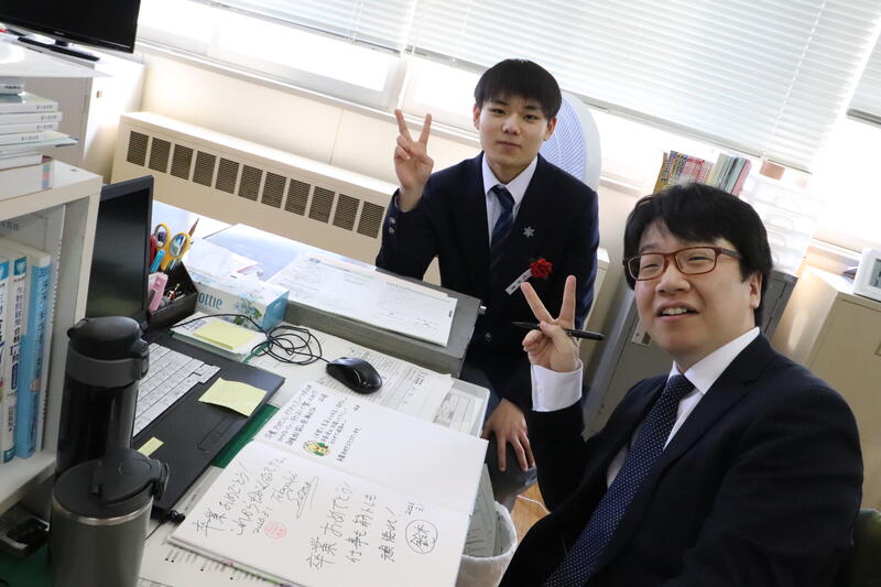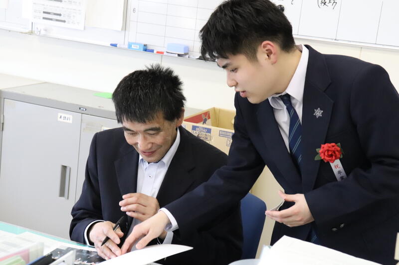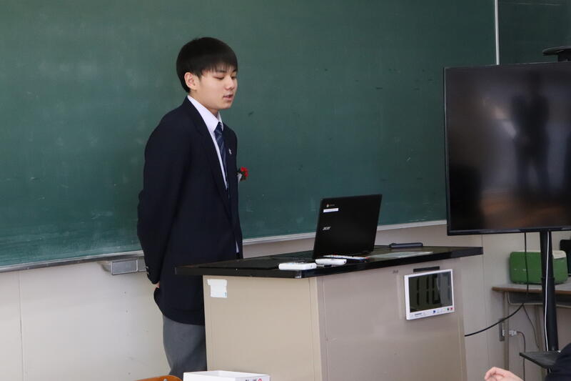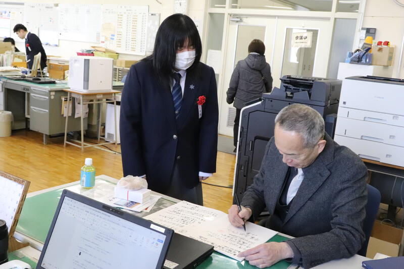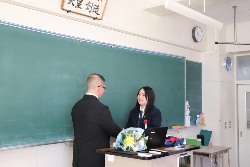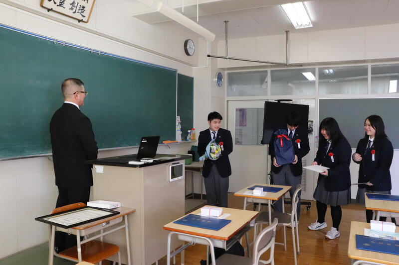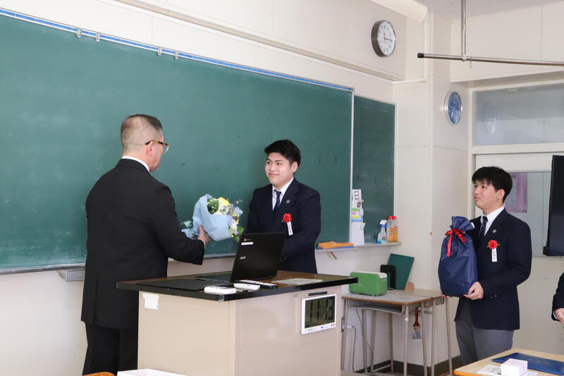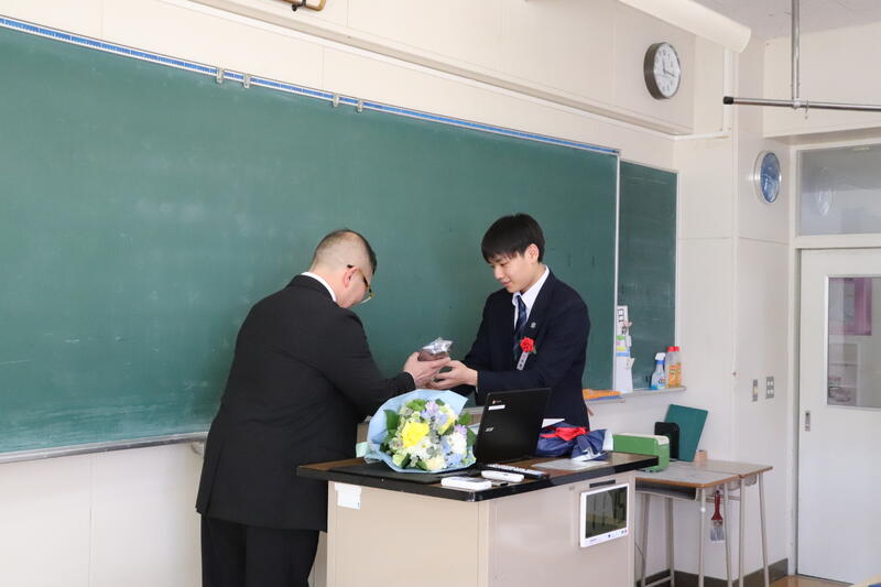 また、卒業生から担任へ感謝の気持ちを込めた贈り物が手渡され、教室は和やかな雰囲気に包まれました。