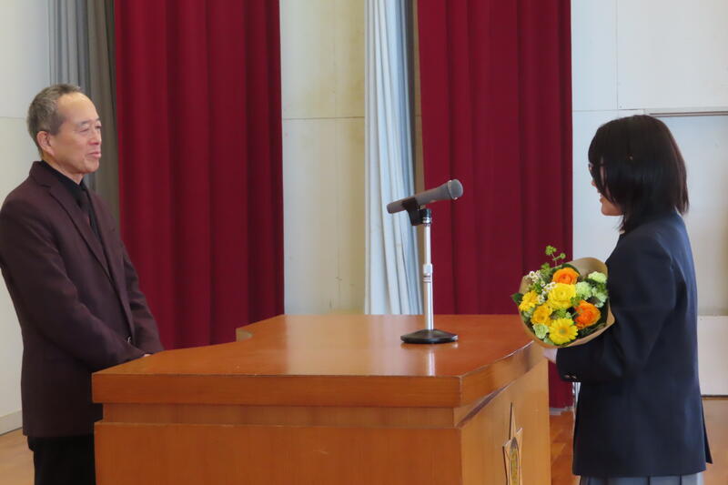 続いて、生徒会長から感謝の気持ちを込めたお礼の言葉が述べられ、花束が贈られました。