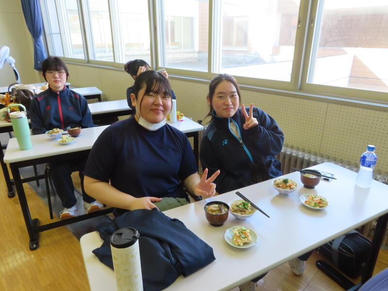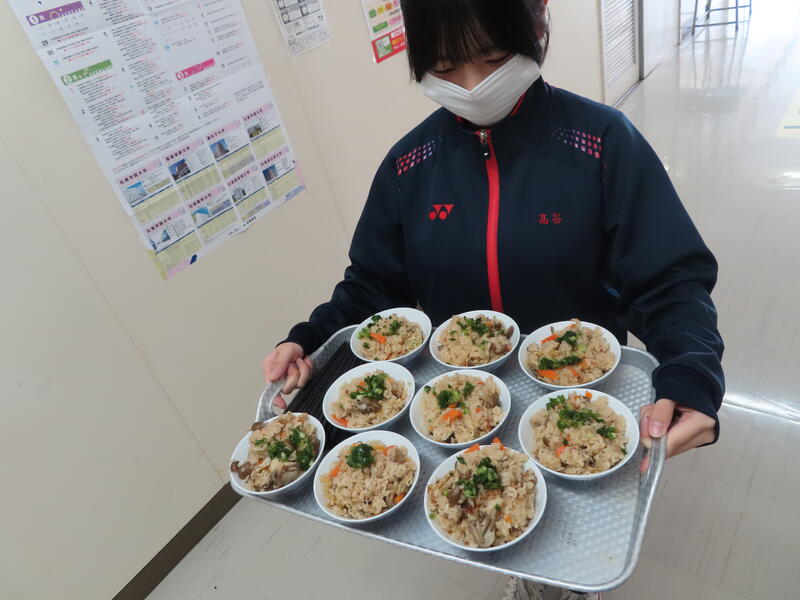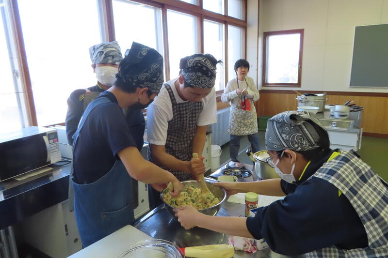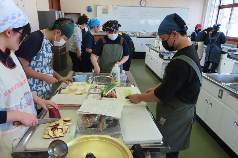その後はグループごとに調理実習を行い、炊き込みご飯、ポテトサラダ、豚汁、さらにかぼちゃのパウンドケーキまで秋らしいメニューを協力して作りました。
